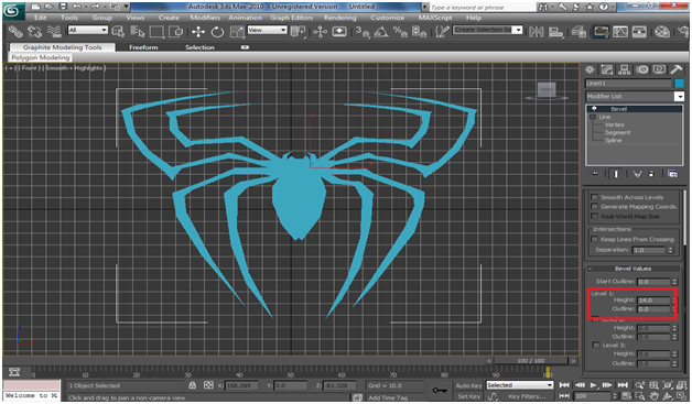11. Setelah itu kita pilih/select pola yang sudah dibuat tadi lalu Modify pada Command Panel, ganti Modifier List pada combobox ganti dengan Bevel.